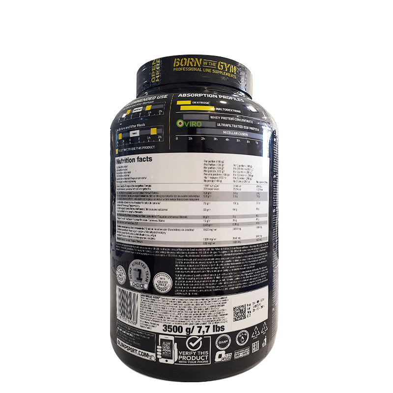 80% carbohydrate-mix (maltodextrins, dextrose), 15,5% protein-mix (whey protein concentrate (from milk), micellar casein (from milk), ultrafiltrated egg protein), aromas, 1,5% creatine monohydrate, 0,5% taurine, medium-chain triglycerides oil (MCT oil), acidity regulators – citric acid, malic acid (for all strawberry like flavours), thickeners – gum arabic, xanthan gum, sodium carboxy methyl cellulose; 0,01% vitamins (L-ascorbic acid – vit. C, DL-alpha-tocopheryl acetate – vit. E, nicotinamide – niacin, D-biotin, retinyl acetate – vit. A, calcium D-pantothenate – panthotenic acid, pyridoxine hydrochloride – vit. B6, cholecalciferol – vit. D, pteroylmonoglutamic acid – folate, thiamin mononitrate – vit. B1, riboflavin – vit. B2, cyanocobalamin – vit. B12), acidity regulators – sodium citrates; sweeteners – acesulfame K, sucralose, cyclamates; emulsifier – soy lecithin; colours: carmine (for all: strawberry, cherry, strawberry-kiwi and banana-cherry like flavours), E 150c (for all: cookies cream, toffee, chocolate, coffee, ice coffee, cappuccino, hazelnut and tiramisu like flavours), riboflavin, E 133 (for all pistachio like flavours).