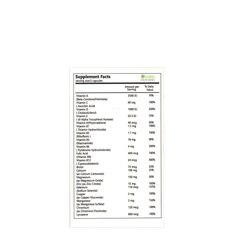 Vitamin A (Beta-Carotene/Palmitate), Vitamin C (Ascorbic Acid), Vitamin D (Cholecalciferol), Vitamin E (dl-Alpha Tocopherol Acetate), Vitamin K (Phytonadione), Vitamin B1 (Thiamin Hydrochloride), Vitamin B2 (Riboflavin), Vitamin B3 (Niacinamide), Vitamin B6 (Pyridoxine Hydrochloride), Folic Acid (Vitamin B9), Vitamin B12 (Cyanocobalamin), Biotin, Calcium (as Calcium Carbonate), Magnesium (as Magnesium Oxide), Zinc (as Zinc Citrate), Selenium (Sodium Selenite), Copper (as Copper Gluconate), Manganese (as Manganese Sulfate), Chromium (as Chromium Picolinate), Lycopene