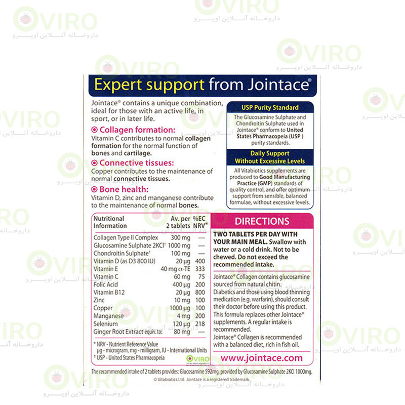 قرص جوینتیس کلاژن ویتابیوتیکس 30 عدد موثر در ترمیم و بازسازی غضروف ها – تاندون ها و مایع مفصلی می باشد و حاوی کلاژن – گلوکزامین – کندروئیتین – ویتامین های B12 D3 E C – مواد معدنی و زنجبیل است.