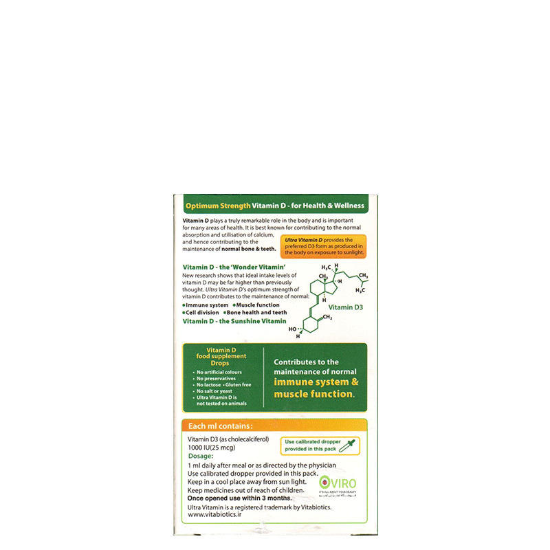 قطره خوراکی اولترا ویتامین د D3 1000 ویتابیوتیکس 30 میلی لیتر با تامین ویتامین D جهت تقویت سیستم ایمنی و استحکام استخوان فرموله شده است.